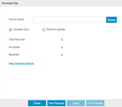 - Perform Update will upload the data and display it in the Previous Pay page of the Wizard for you to confirm by moving Next. Select this option to upload and update information in your database.